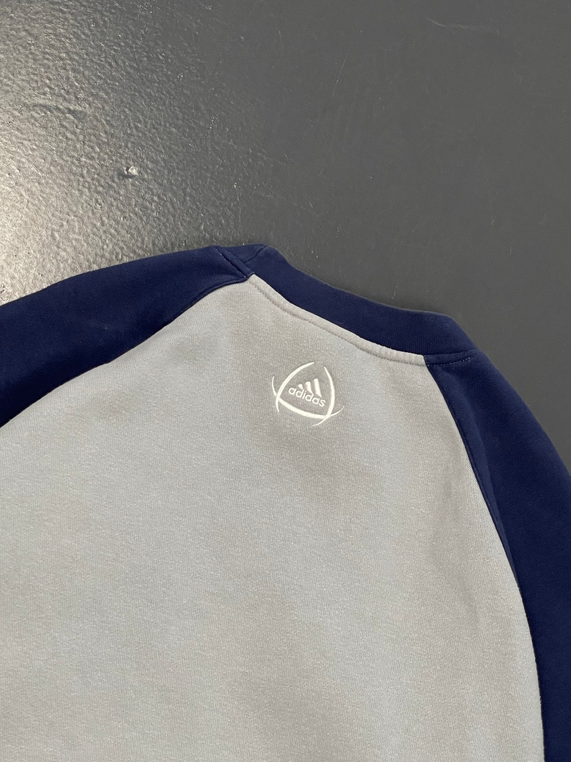 Descripción: Suéter de marca Adidas, de color gris y azul, con logo delantero y trasero