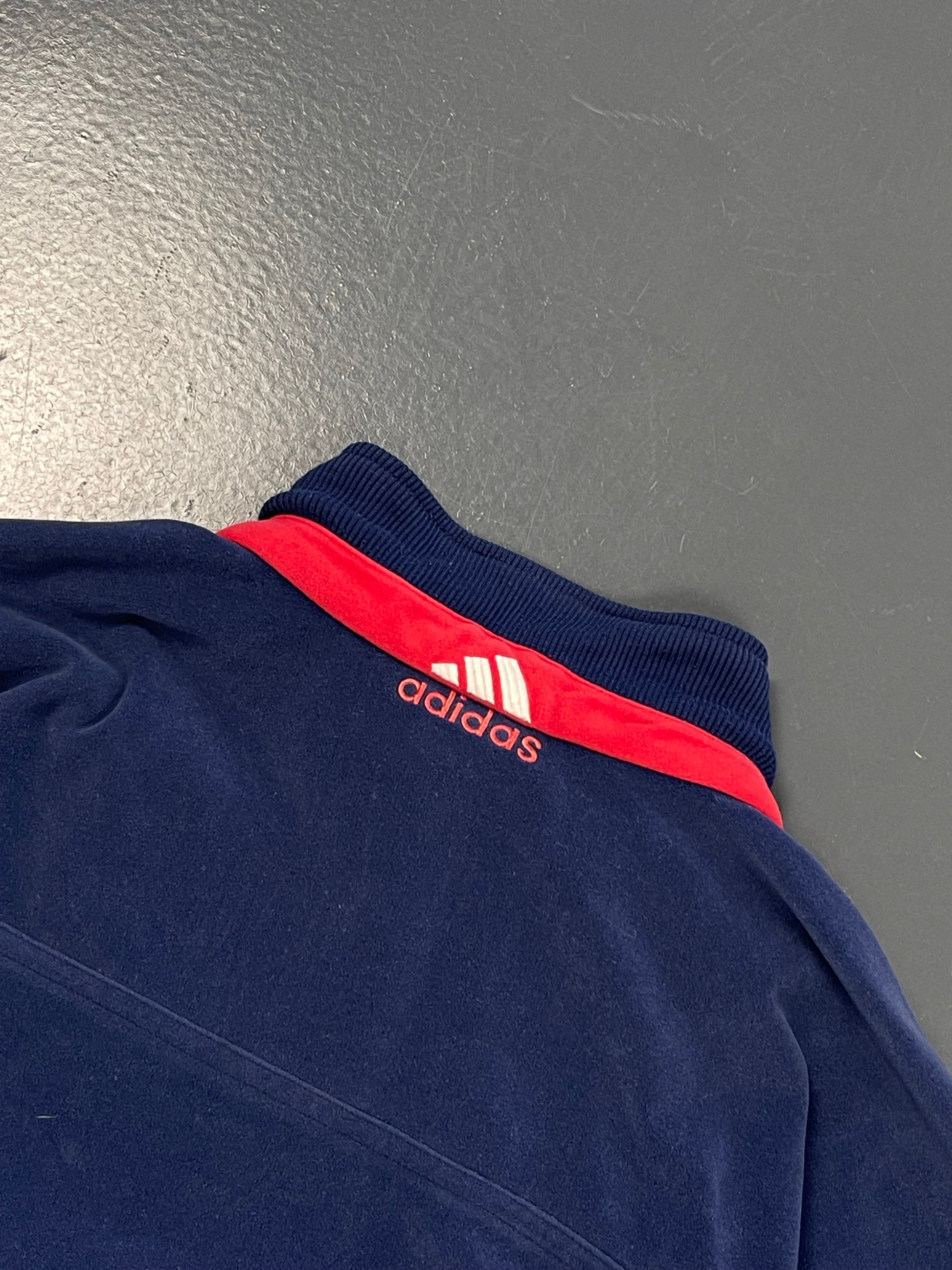 Descripción: Cortavientos con cuello alto y cremallera, de marca Adidas, de color azul marino y detalles en rojo y blanco, logo bordado en el pecho y espalda, material terciopelo